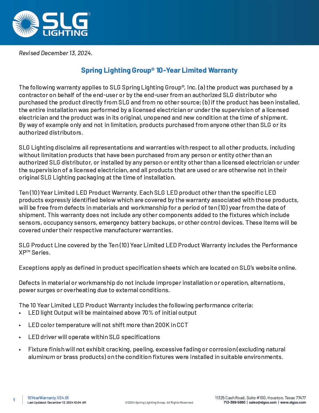 SLG 10 Year Product Warranty Document