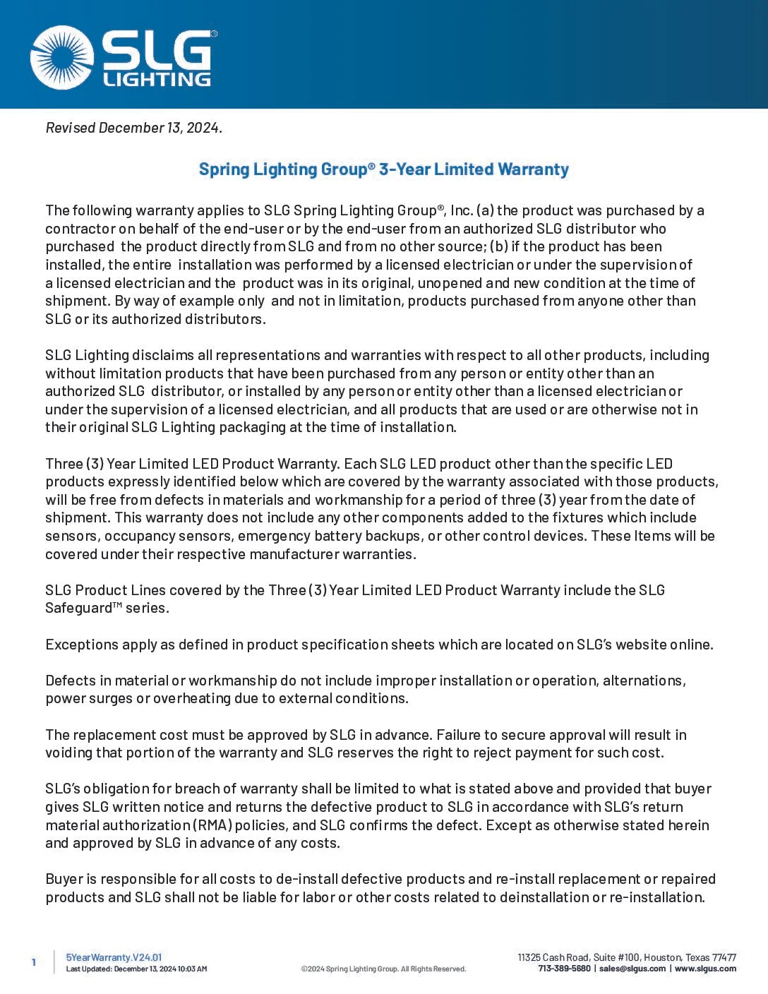 SLG 3 Year Product Warranty Document
